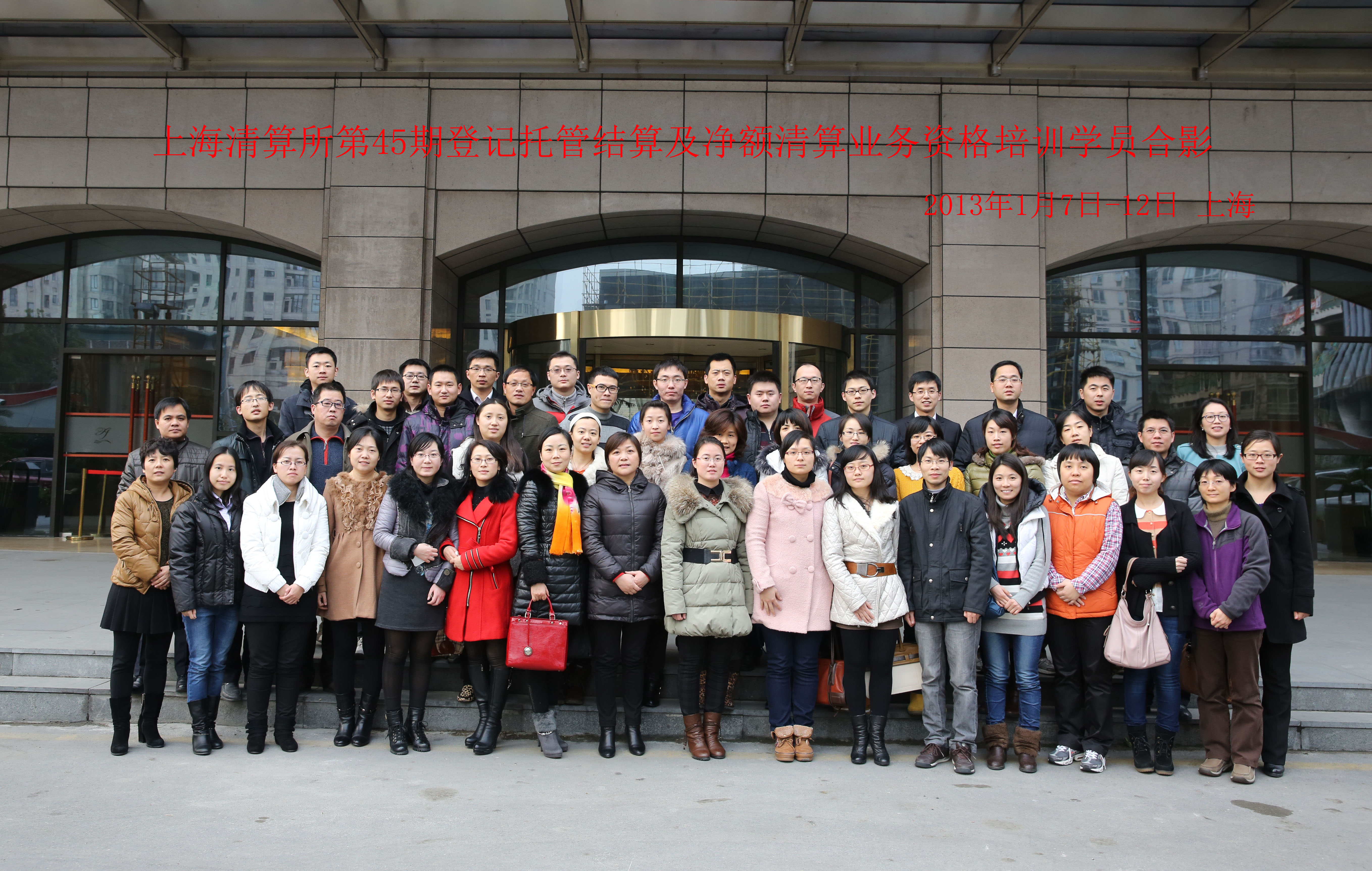 上海清算所第45期登记托管结算及净额清算培训于2013年1月7日-12日在上海举行,本期共计48位学员参加,来自25家机构。培训主要内容包括银行间债券市场政策及创新金融产品介绍,短期融资券(CP)、超短期融资券(SCP)、信用风险缓释凭证(CRMW)、非公开定向债务融资工具(PPN)、信贷资产支持证券(ABS)、非金融企业资产支持票据(ABN)及中小非金融企业集合票据(SMECNⅡ)等产品登记结算业务规则、操作指南讲解,净额清算业务规则、业务指南和风险管理制度讲解,登记托管结算及净额清算业务客户终端操作及应急操作流程讲解等。通过培训,46位学员通过笔试与客户端操作机考,取得了上海清算所登记托管结算及现券交易净额清算业务上岗资格。