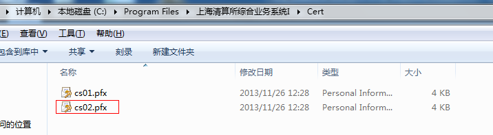 2、 将CFCA证书如cs02.pfx上传至C:\Program Files\上海清算所综合业务系统I \Cert目录下,如图: