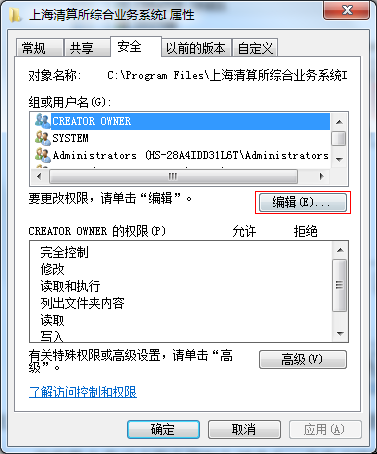 A:在Windows 7上,客户端使用过程中可能出现各类由于权限限制而无法操作的提示,若出现这类错误提示,请先以操作系统管理员权限修改“C:\Program Files\上海清算所综合业务系统I”客户端安装目录安全设置,增加该用户的“修改”权限,步骤如下:
