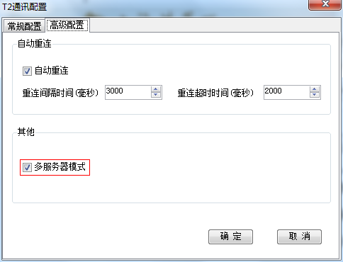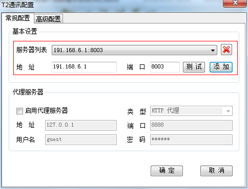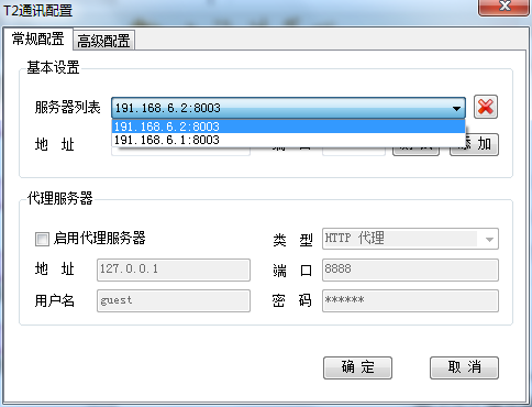 3、在弹出的T2通讯配置页面的常规配置页签中,从服务器列表上选择一个服务器地址或者手动输入地址和端口