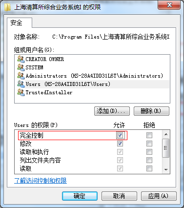 (3) 在上述界面中点击“编辑”按钮,弹出权限设置对话框,并选择Users用户组。在Users的权限中保证“完全控制”被选中,点击“确定”按钮退出。