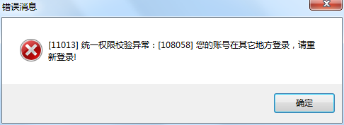 2.2.5 Q:操作过程中系统报错“统一权限校验异常:您的账号在其它地方登陆,请重新登录”(如下图)