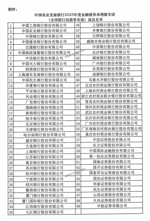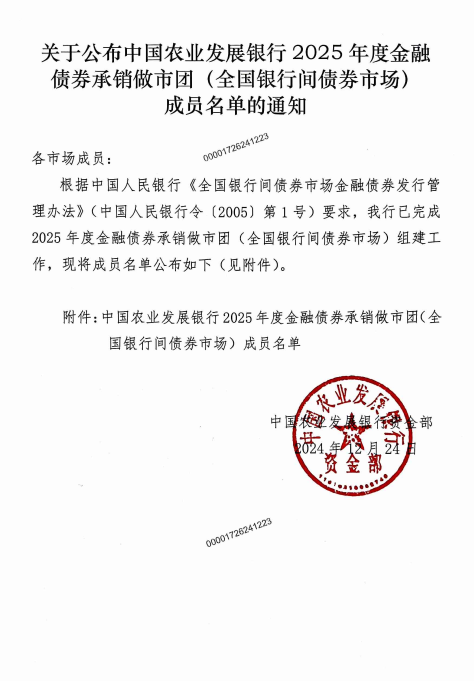 关于公布中国农业发展银行2025年度金融债券承销做市团(全国银行间债券市场)成员名单的通知