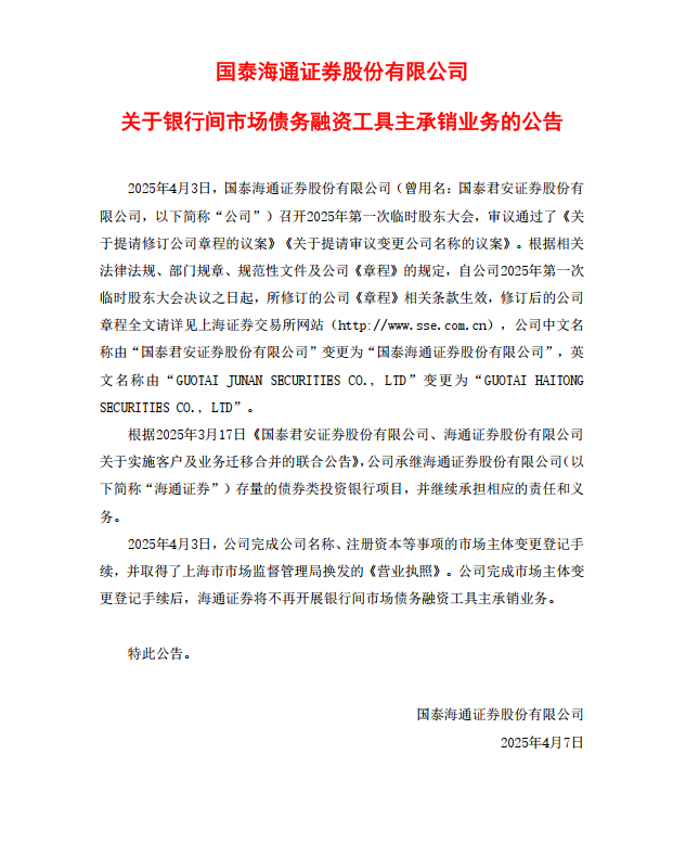 国泰海通证券股份有限公司关于银行间市场债务融资工具主承销业务的公告