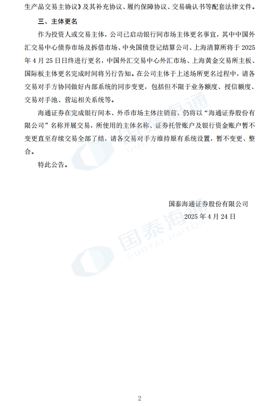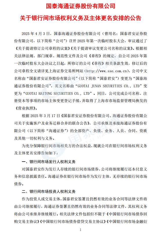 国泰海通证券股份有限公司关于银行间市场权利义务及主体更名安排的公告