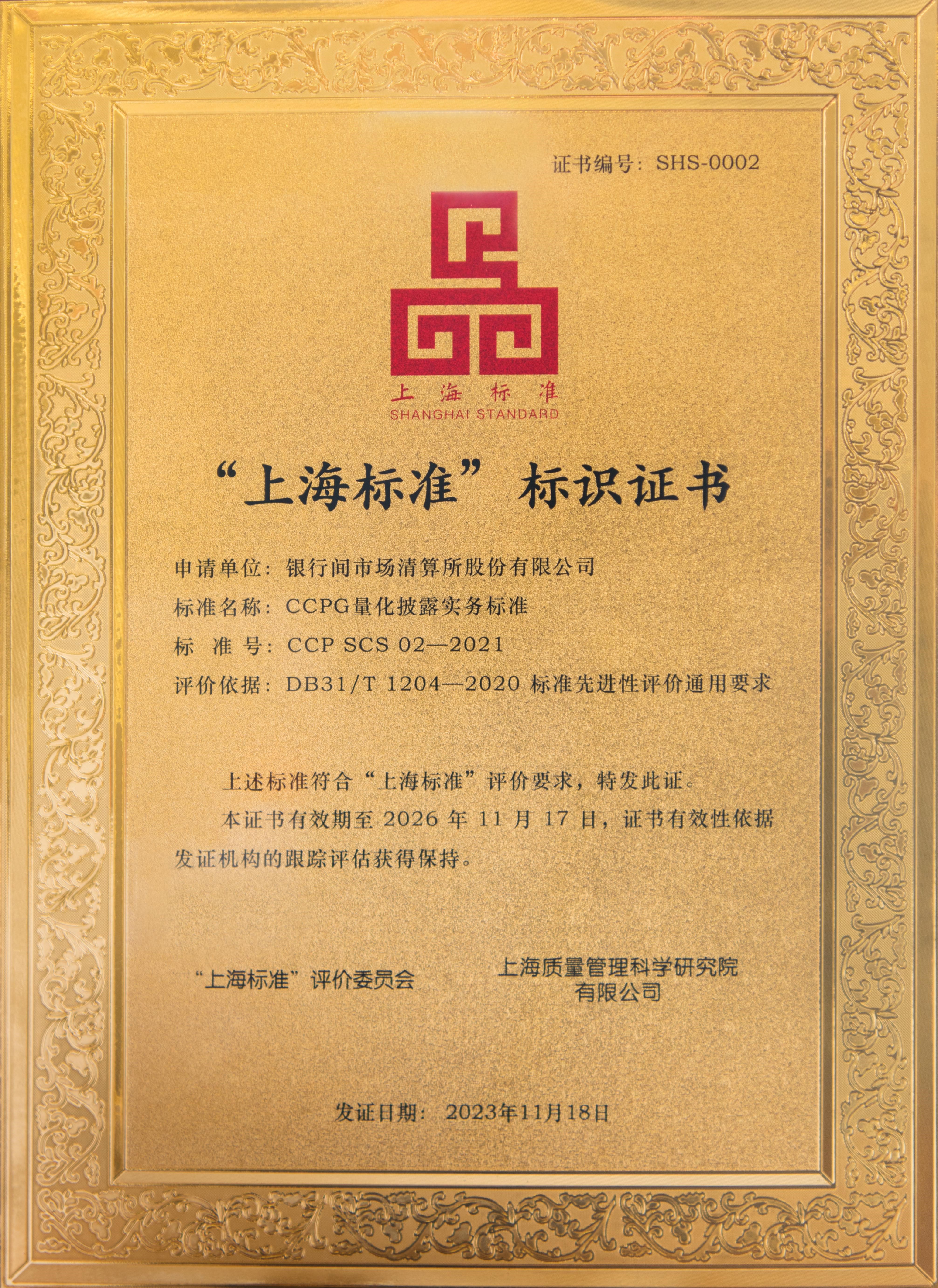 由全球中央对手方协会(CCPG)和上海清算所联合申报的《CCPG量化披露实务标准》(简称“上海清算标准”)通过“上海标准”复评,继续获选“上海标准”。“上海标准”是上海市推进“四大品牌”和“五个中心”建设的重要举措,通过鼓励和促进符合国内领先、国际先进要求的高水平标准的制定和应用,支撑上海高质量发展和国际影响力提升。2020年,“上海清算标准”入选上海市首批“上海标准”。
