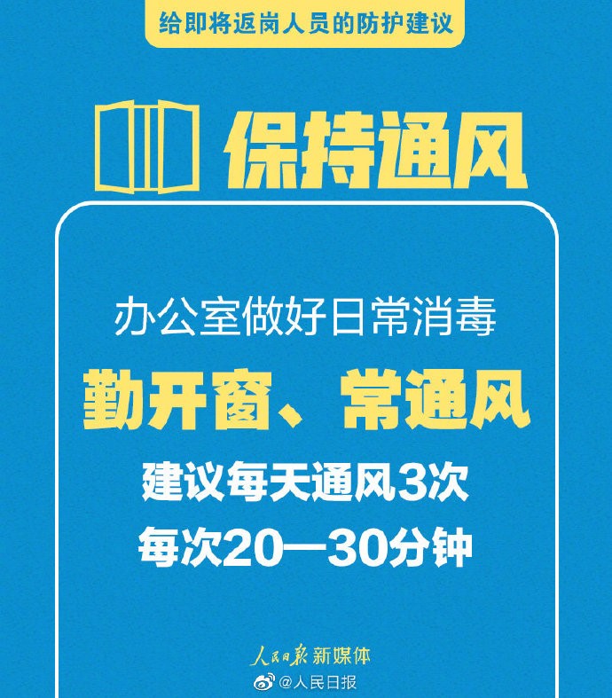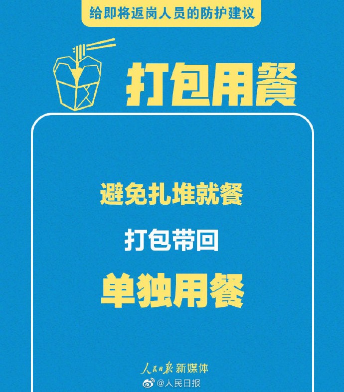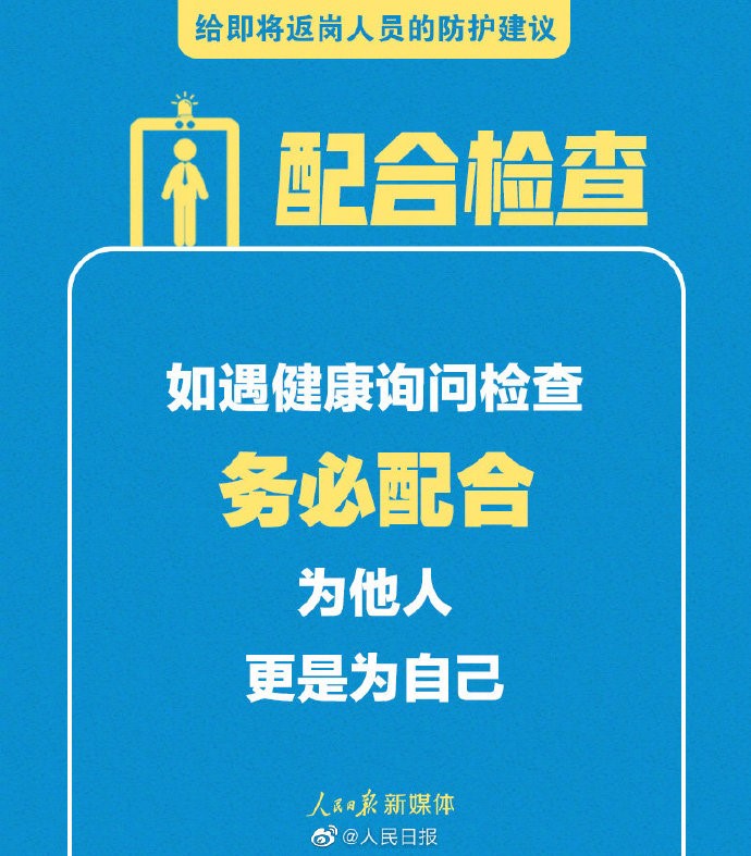 三、保护自己,关爱他人。要保持良好的个人卫生习惯,戴口罩、勤洗手、多通风,自觉维护环境卫生清洁。要提高自身抵抗力,充分休息、适当运动、均衡饮食。要积极配合社区、街道以及公司开展的疫情排查工作,详尽告知接触史和旅行史;若需隔离医学观察,请依法履行公民义务。要加强自我保护意识,返工时减少使用公共交通工具,若需使用,请带口罩、手套,做好清洁和消毒;到工作区域请按要求做好工作区域的消毒和防护工作;若自身出现相关症状,请佩戴口罩、手套及时就医,并避免乘坐公共交通工具。要关心身边人的健康状况,对于未按要求做好个人防护的要及时提醒,对于不执行防疫要求的要及时规劝,若发现他人有疑似感染情况,请第一时间与有关部门联系,将危险杜绝在摇篮之中。