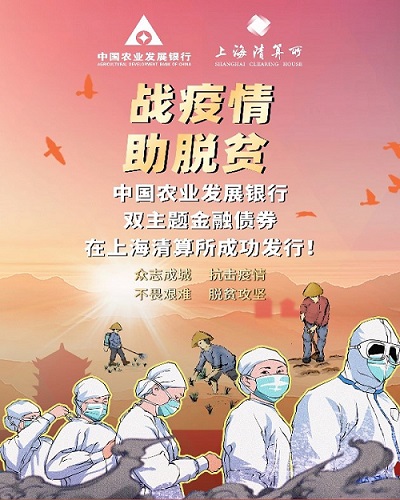 2月11日,银行间市场清算所股份有限公司(以下简称上海清算所)支持中国农业发展银行(以下简称农发行)以公开招标方式,成功发行全国首单“战疫情 助脱贫”双主题金融债券,募集资金同时用于支持新冠肺炎疫情防控、产业扶贫相关领域的贷款投放。本期债券发行规模为50亿元,债券期限为2年,参考收益率为2.2951%,较前一日到期收益率低28个bp,市场认购踊跃,形成了良好的示范效应。同时,上海清算所与农发行联合面向农发债承销做市团成员发布“坚决打赢疫情防控阻击战、全面决战决胜脱贫攻坚战”倡议书(附件),彰显了金融市场凝心聚力打赢疫情防控阻击战和脱贫攻坚战的坚定信心。