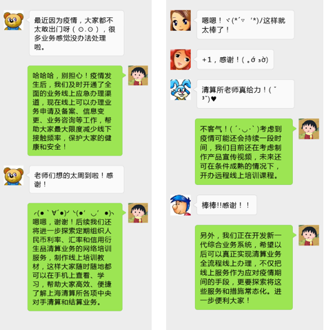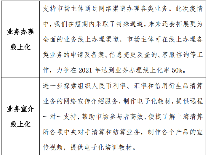 疫情期间,上海清算所尝试了机构业务申请及备案、信息变更、业务咨询等事项的应急线上服务,得到了市场机构的好评。下一阶段,上海清算所将持续探索全流程清算结算业务线上服务,借助新一代综合业务系统,使之制度化、常态化,进一步提升机构业务参与体验。
