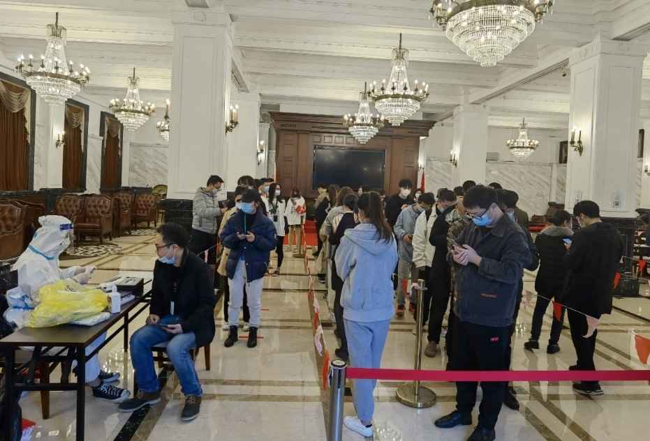 随着防疫要求日趋严格,如何便利安全、迅速及时做好公司全体人员的核酸检测工作,成为人力资源部在这场疫情加时赛中的头条难题。人力资源部第一时间联系确定核酸检测机构,在公司内部设置指定区域,定时分批组织开展核酸检测,累计5场近1600人次。期间,人力资源部专门成立了一支现场组织小分队,周怡凤、伍诗雨和方海瑞等员工风雨无阻、起早贪黑,以尽快完成取样并尽早得到检测结果;为了提升组织效率和安全性,他们不仅根据各部门预估人数提前划分检测时段,还利用微信小程序建立电子签到渠道,增设签到及流程指引,最大程度降低人员接触。在检测机构仅派出一名医生的情况下,每次300人左右的单次驻场检测均保证在2.5小时内有序完成。