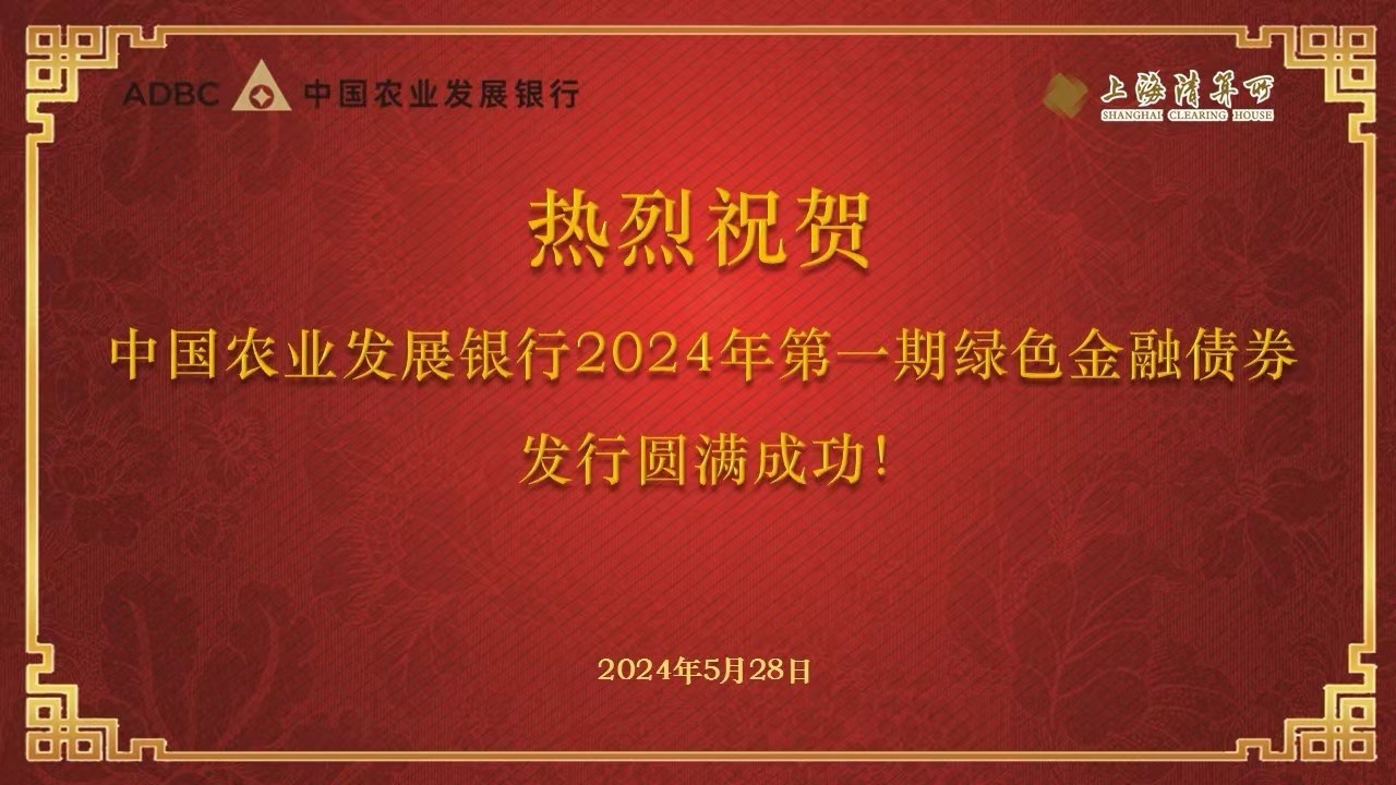 2024年5月28日,上海清算所成功支持中国农业发展银行(以下简称农发行)发行2024年第一期绿色金融债券。本期债券发行规模30亿元,期限为2年,发行利率为1.74%,认购倍数4.83,获得投资者踊跃认购。农发行孙孝坤副行长赴上海清算所调研并见证本期债券发行,上海清算所马贱阳董事长参加调研并主持座谈,农发行上海市分行、总行资金部主要负责人参加。