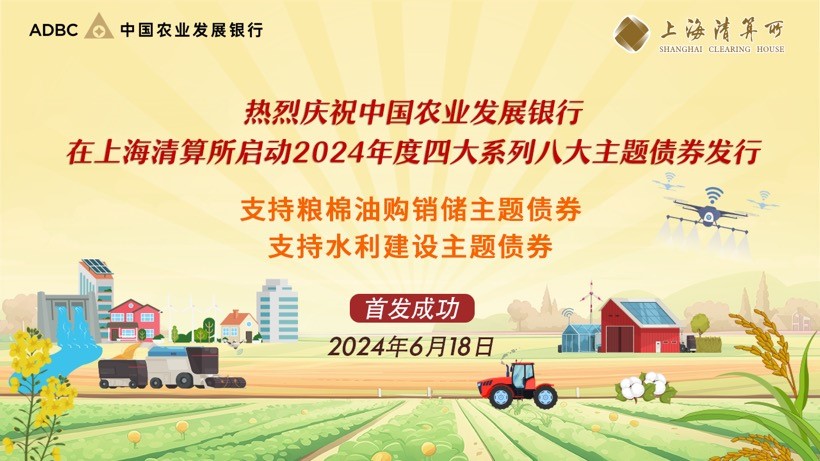 6月18日,上海清算所支持中国农业发展银行(以下简称农发行)通过公开招标方式,成功首发2年期支持粮棉油购销储主题债券50亿元、7年期支持水利建设主题债券20亿元。发行利率分别为1.8119%、2.1800%,认购倍数分别为4.33倍、7.24倍,受到市场广泛认可。