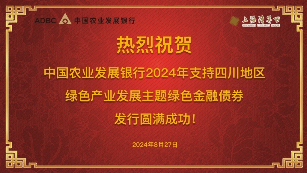 2024年8月27日,上海清算所成功支持中国农业发展银行(以下简称农发行)发行2024年支持四川地区绿色产业发展主题绿色金融债券。本次发行规模30亿元,债券期限2年,发行利率1.4553%,认购倍数3.87,市场认购踊跃。农发行党委委员吴涛到访上海清算所进行调研并见证本次发行,上海清算所党委书记、董事长马贱阳主持座谈,农发行上海市分行行长高家宝、农发行资金部总经理韦士歌、上海清算所副总经理王维强参加。