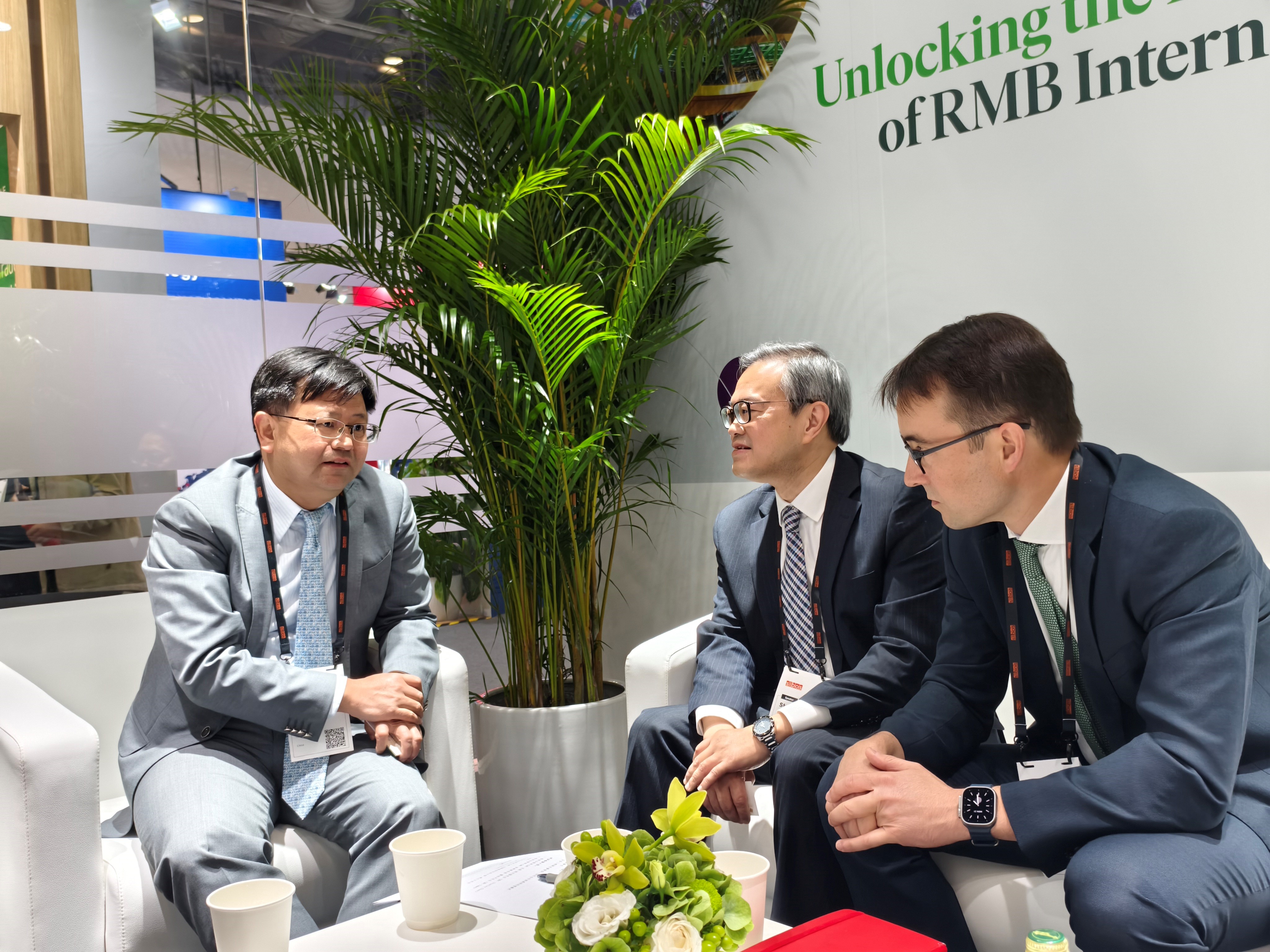 10月21日,马贱阳董事长在SIBOS年会期间会见明讯证券首席执行官Samuel Riley一行。双方就国际业务开展情况、国际投资者业务习惯和主要需求、未来合作方向等内容进行了讨论,并一致同意将持续保持交流,进一步深化跨境业务合作。
