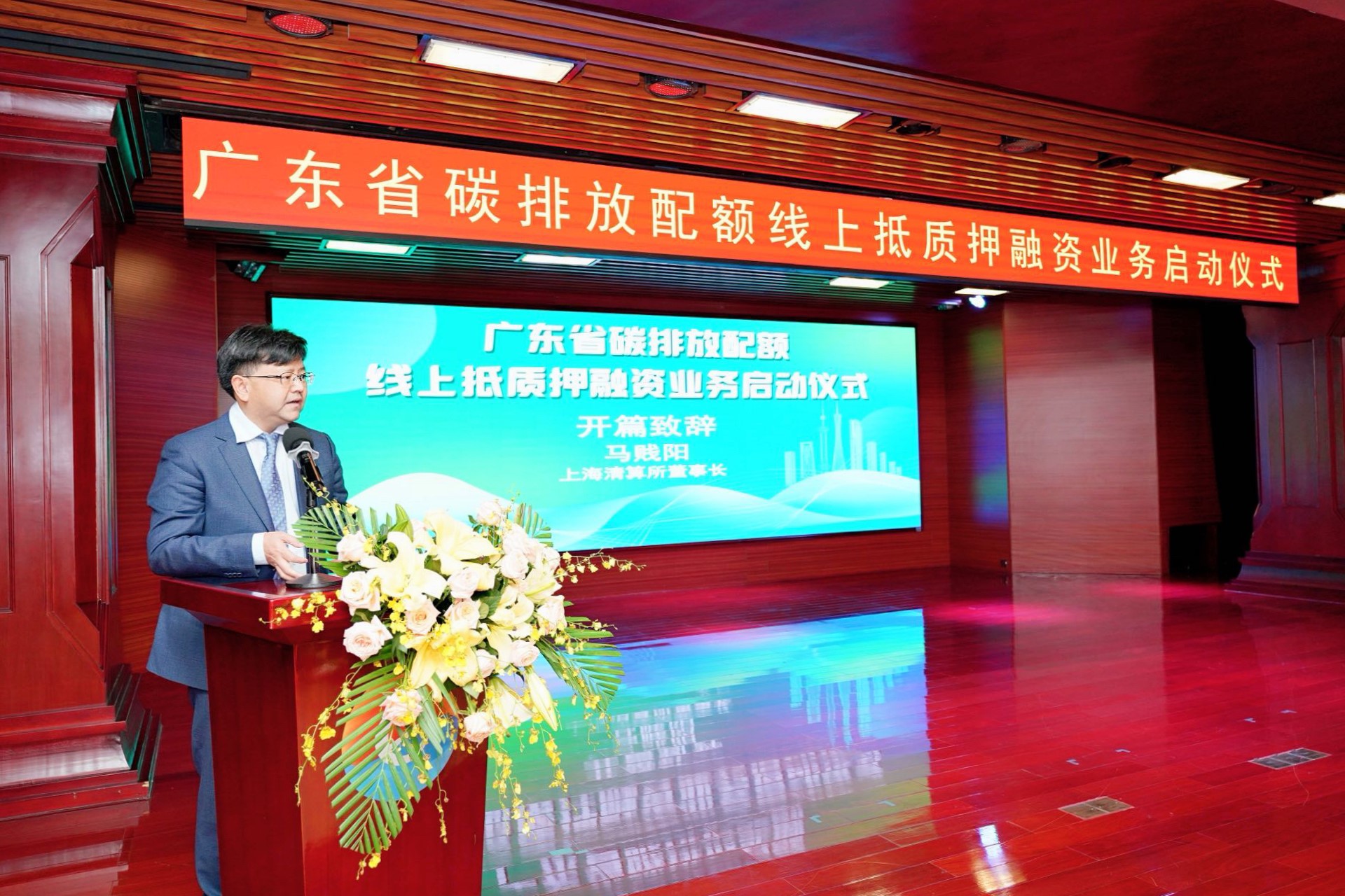 上海清算所董事长马贱阳、广州交易集团董事长葛群致开篇辞。中国人民银行广东省分行副行长林平、广东省委金融委员会办公室副主任倪全宏、华夏银行副行长刘瑞嘉、广东省生态环境厅副厅长周国英、广州市政府副秘书长孟昊、广州交易集团总经济师张石波出席并致辞,上海清算所副总经理王维强出席启动仪式。商业银行、证券公司、控排企业、碳资产管理公司等市场主体代表近百人参会。
