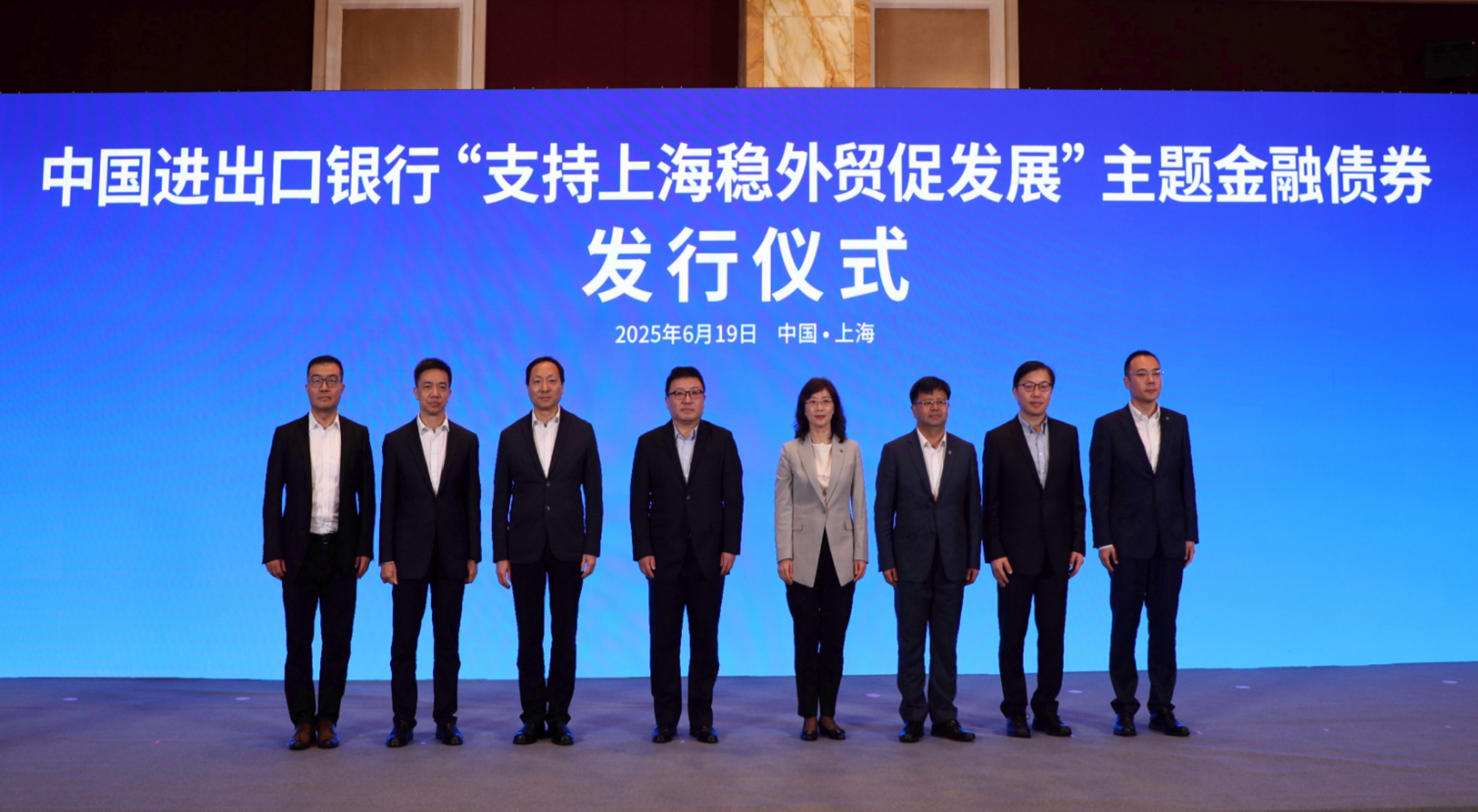 2025年6月19日,中国进出口银行在2025陆家嘴论坛分会场隆重举办“支持上海稳外贸促发展”主题债券发行活动,上海市委常委、常务副市长吴伟,中国进出口银行党委副书记、行长王春英,上海清算所党委书记、董事长马贱阳等共同出席活动。