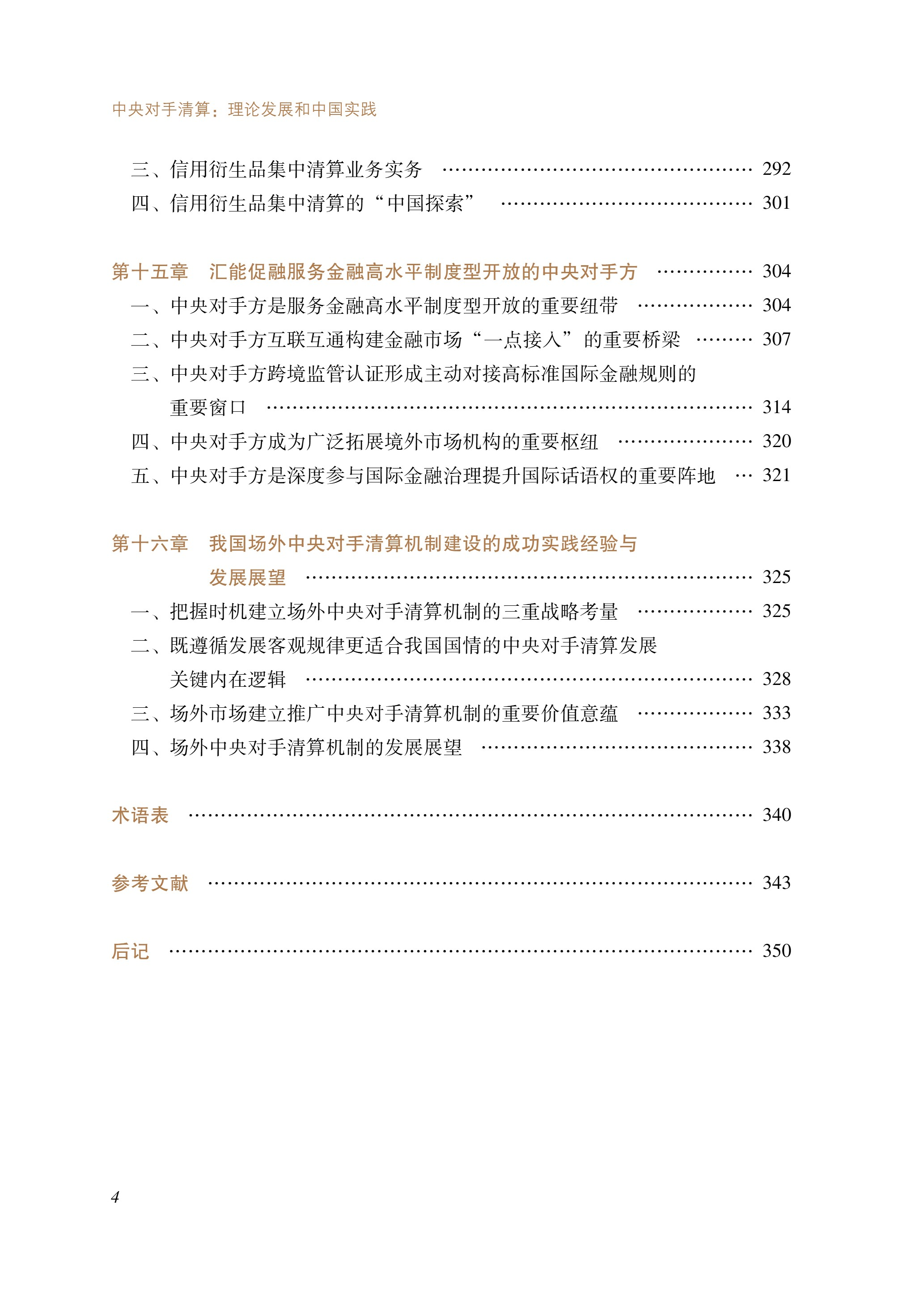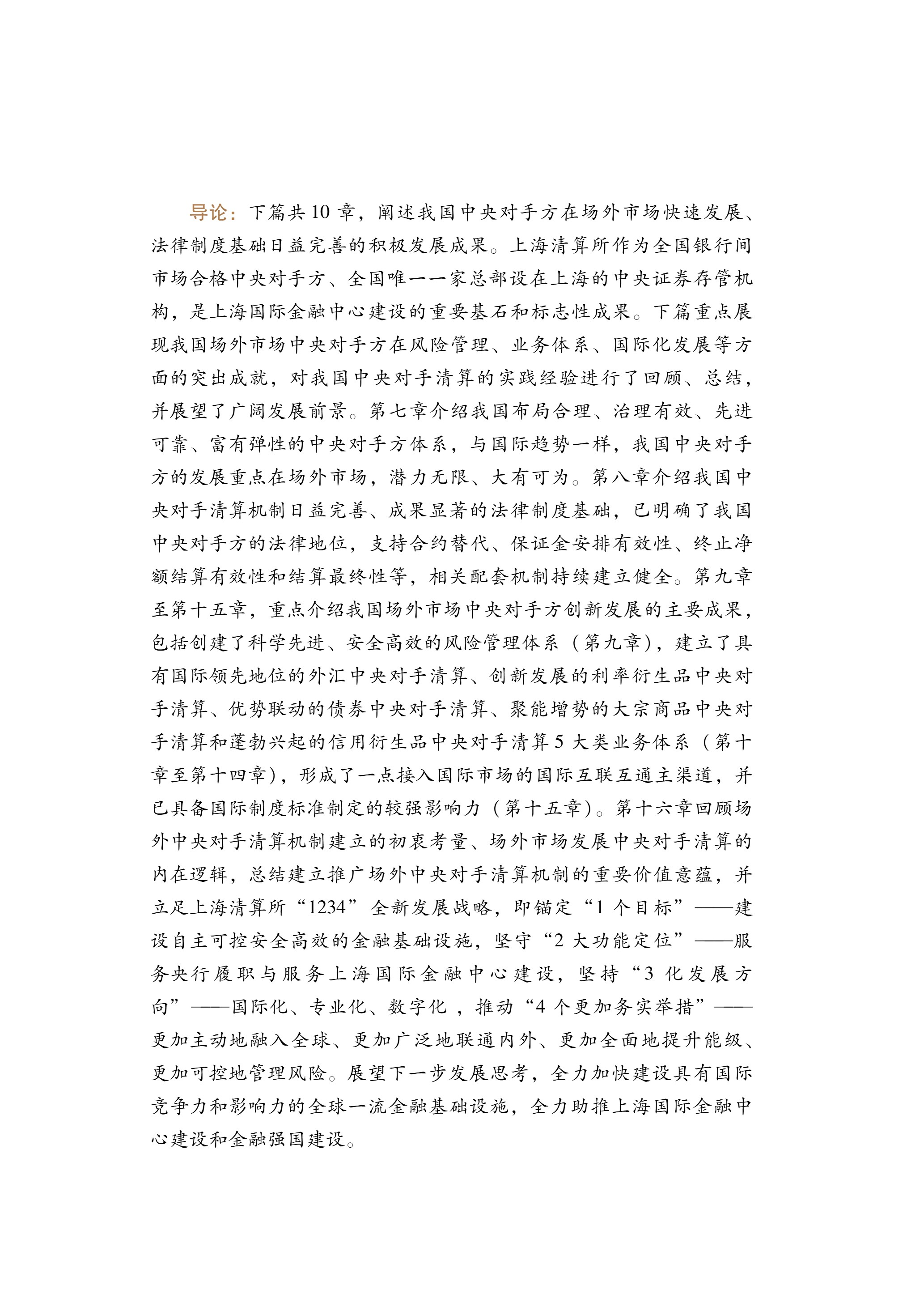 当前,国内外中央对手清算的理论和实践正处于快速创新发展和变革的浪潮中,新的挑战和机遇不断涌现。本书的撰写和出版旨在从理论研究角度深入思考总结中央对手清算微观机制的宏观功能作用、国内外前沿发展趋势等,期望与市场各方携手推动中央对手清算机制走出一条中国特色的实践之路,更好服务央行履职、服务上海国际金融中心建设。