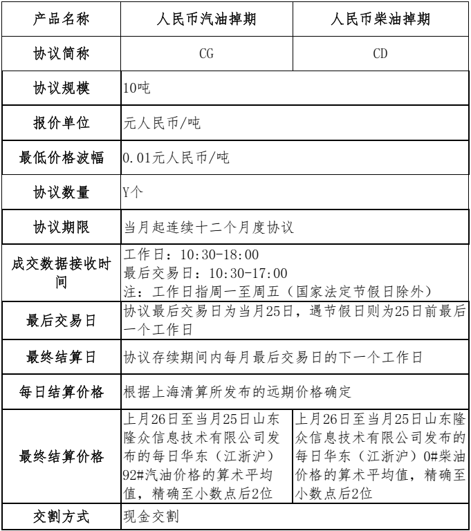 人民币汽油掉期、柴油掉期分别是以山东隆众信息技术有限公司发布的92#汽油华东(江浙沪)现货价格、0#柴油华东(江浙沪)现货价格为标的,现金交割,以人民币进行计价、清算和结算的场外大宗商品衍生品,上海清算所为二者提供中央对手清算服务。